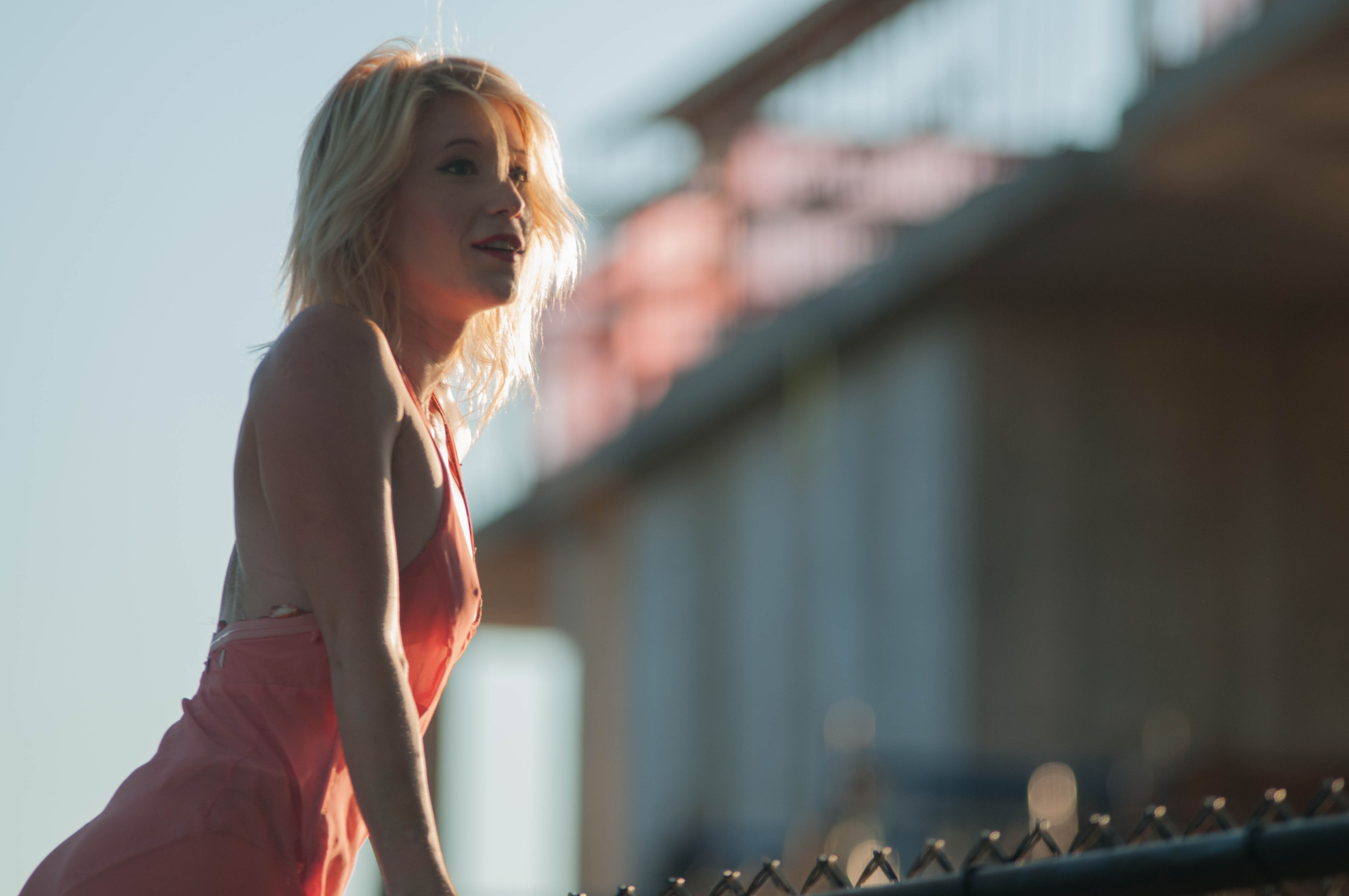 KateWSept2015-23 September 17, 2015 4288 × 2848 Kate—Sunset in Brooklyn Bridge Park Climbing the fence in Pink dress